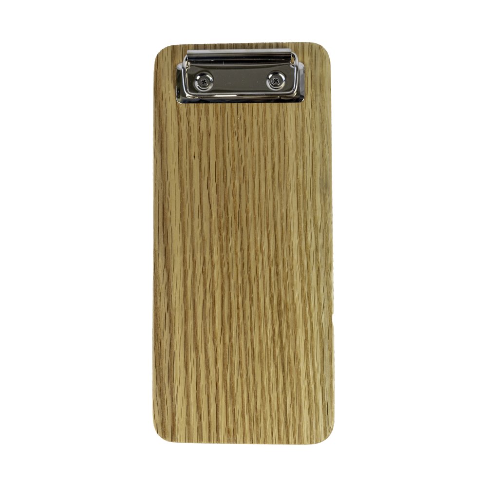 Made from ¼” solid oak and finished with a clear lacquer, this sturdy clip-style check presenter brings natural charm to the tabletop. Rounded edges and a slim profile make it practical and stylish. Choose from silver, antique brass, or black clips to complete the look. A simple, functional choice with rustic appeal.