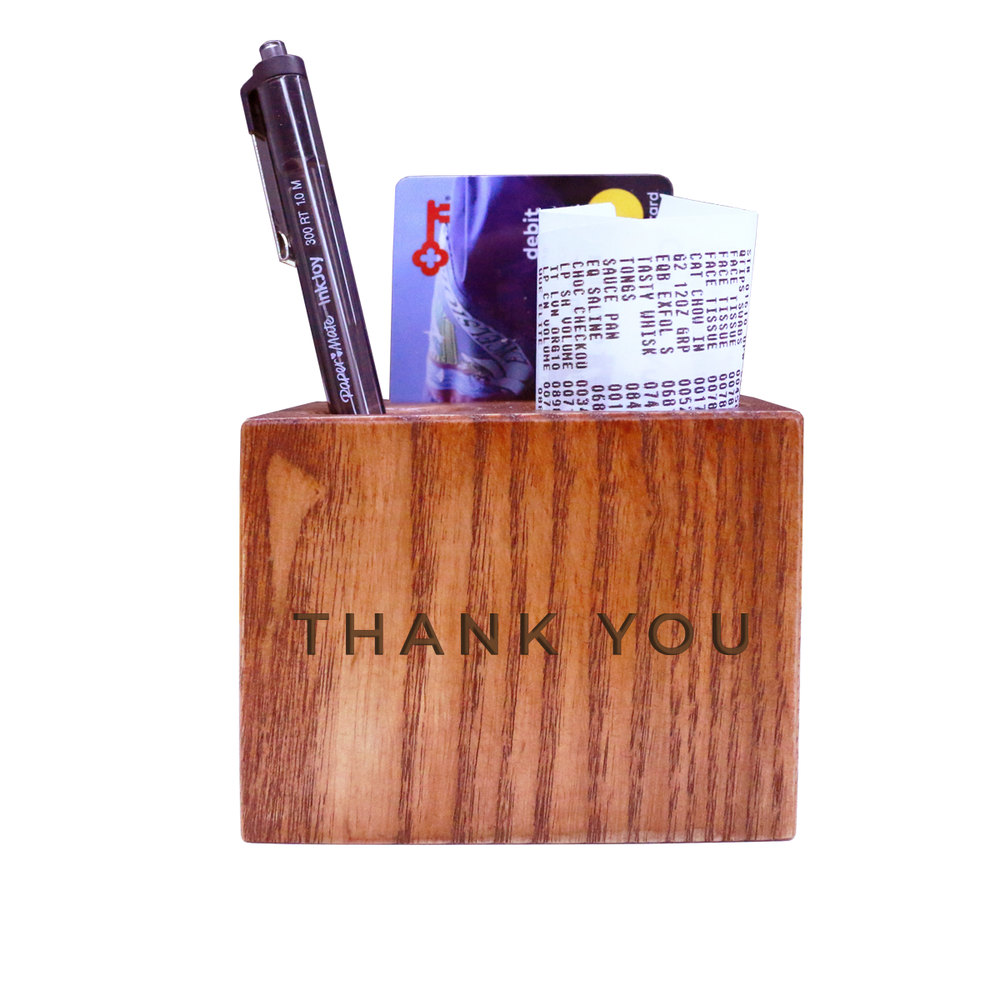 This countertop check presenter is designed for efficiency and visual impact. Handcrafted from wood with three top slots for a guest check, pen, and card, it keeps everything neat and organized. Choose a “Thank You” engraving or add your custom logo with a laser imprint. Ideal for cafés, breweries, or casual restaurants with counter service.